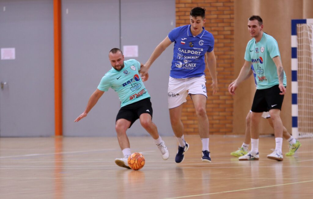 Mecz dwóch niepokonanych zespołów zapowiadał się ciekawie. W Galporcie pierwszy raz zagrali Kamil Domański i Filip Tadych, czyli byli zawodnicy Raf-Mix’a. Za zabrakło Damiana Stasikowskiego. U wicemistrza nieobecni byli Maciej Sieradzki i Damian Tokarski, za to pojawił się Paweł Dudzik, który odegrał ważną rolę w tym spotkaniu. Już w 28. sekundzie bliski zdobycia gola był Domański, ale piłka zatrzymała się na słupku. Dwie minuty później bliski otwarcia wyniku był Marcin Mikołajewicz, lecz świetnie spisał się Fabian Hiller. Golkiper Galportu kilka chwil później zapędził się na połowę rywali i oddał groźny strzał, z którym problemy miał Szymon Kmiecik. W 5. min. znów szczęścia zabrakło Kamilowi Domańskiemu, bo tym razem z bliska trafił w słupek. 55 sekund potem Raf-Mix objął prowadzenie. Z autu grę wznowił Mateusz Kończalski, a ładnym uderzeniem pod poprzeczkę popisał się Paweł Dudzik, który ostatnio w naszej lidze grał w sezonie 2020/21. Beniaminek mógł szybko wyrównać, ale z kolei Tadychowi przeszkodził słupek. W 7. min. dwoma świetnymi interwencjami popisał się Szymon Kmiecik broniąc groźne uderzenia Macieja Śliwińskiego i Olafa Wójtowicza. Potem bramkarz Raf-Mix’a nie dał się zaskoczyć Domańskiemu, Jakubowi Bollinowi i Kacprowi Piórowi. Raf-Mix do przerwy miał jeszcze 2-3 dobre sytuacje na podwyższenie wyniku, ale zabrakło ich finalizacji.